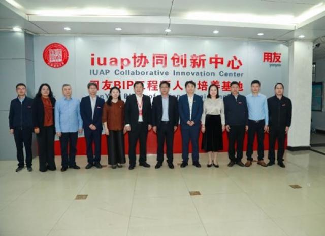 2023年10月27日,用友网络公司董事长王文京校友(左六)出席iuap协同创新中心揭牌仪式