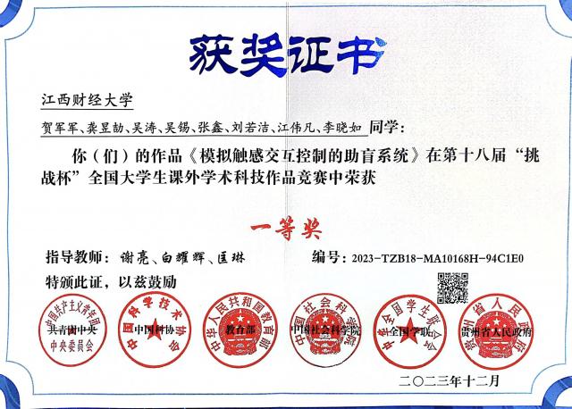 其中,2018年,学院学生科创团队在与北京大学等名校团队的竞争中脱颖而出,为学校取得“创青春”全国金奖零的突破;2019年,学院学生科创团队以全国本科第一名的成绩,与清华大学博士生团队并列获得第十六届“挑战杯”科技发明类特等奖,这是挑战杯办赛30年以来,江西省高校中“挑战杯”科技发明类全国特等奖零的突破,也是全国财经院校科技类全国特等奖零的突破;2021年,学院学生科创团队获第七届“互联网+”全国银奖,为 御书屋 取得中国国际“互联网+”大学生创新创业大赛的历史突破。2023年,学院学生科创团队以江西省第一顺位获“挑战杯”全国一等奖,并斩获中国国际大学生创新大赛一银一铜佳绩。2024年,学院学生科创团队作品《得芯应手》在第十四届 “挑战杯” 秦创原中国大学生创业计划竞赛(原 “创青春”)中再次斩获国家金奖。学院“金字招牌”——谢亮老师指导的“芯创客”学生竞赛团队7次入围“挑战杯终审决赛,取得教育部A类竞赛榜单赛事奖项80余项。