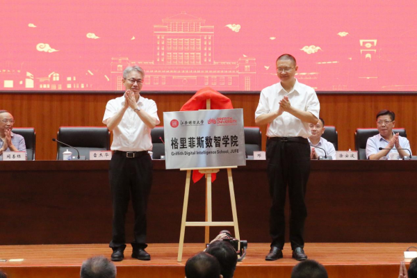 Subsequently,witnessed by all attendees, Lei Jiehua and Liu Yaobin unveiled the plaque for the Griffith Digital Intelligence School,JUFE.Tu Anbo and Yuan Honglin unveiled the plaque for the Economic ForeignAffairs Research Center.