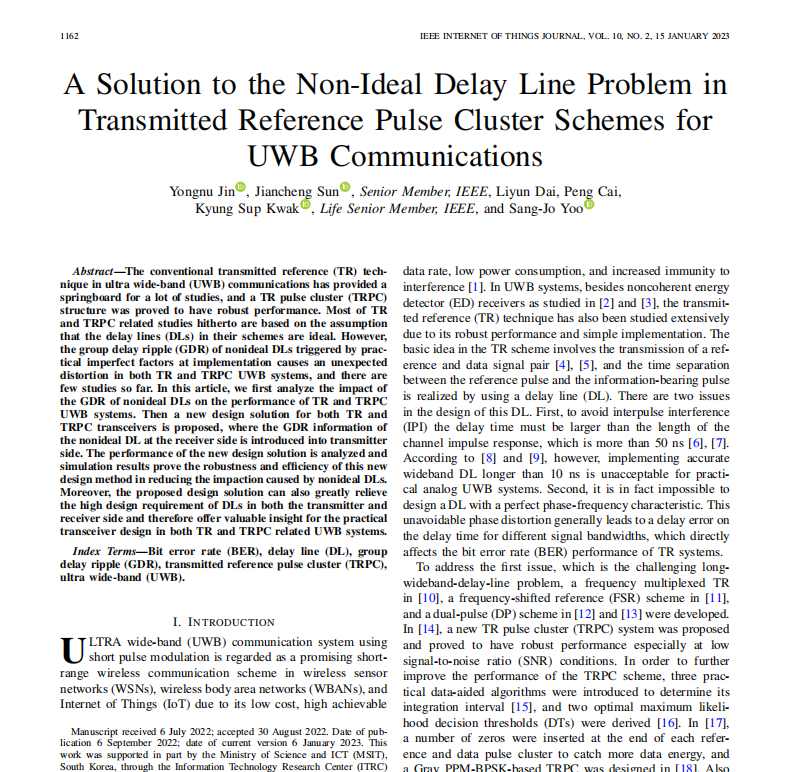 Recently,the paper A solution to the non-ideal delay line problem in transmitted reference pulse cluster schemes for UWB communications byDoctor JinYongnu of School of Software and Internet of Things Engineering, Jiangxi Univeristy of Finance and Economics, was published in IEEEI nternet of Things Journal,a famous journal information sciences in the field of computer information systems.