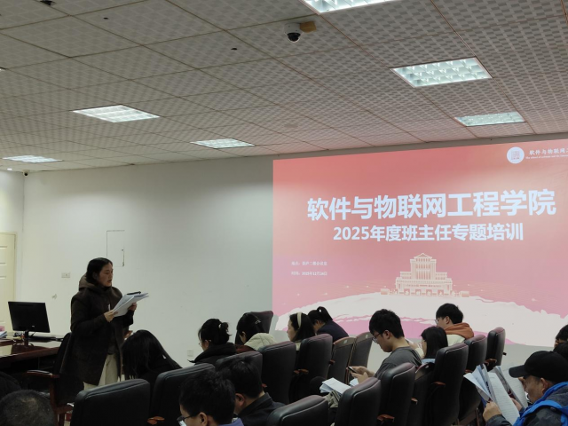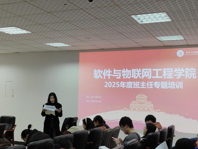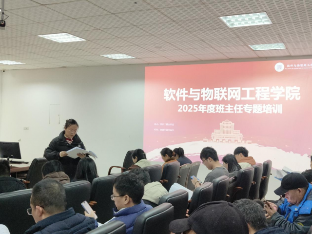 会议第二项,学院学工团队围绕年度学生工作主线,依次就各项工作进行了通报与部署。梅文娟首先就学院2025年度学生工作在思政引领、学风建设、实践育人等方面取得的成效作了全面回顾,详细解读了综合素质测评等班主任关键工作流程,并介绍了“软件培优班”项目的育人成果及二期旁听生计划。龚晨晨汇报了本年度团委在思想引领、学科竞赛、社会实践等方面的工作成果,并强调了第二课堂学分要求与认定途径。陶丽结合具体案例,分享了宿舍矛盾调解的有效方法与校园安全风险防范要点。邹璐通报了截至12月24日的2026届毕业生就业签约数据,并对下一阶段就业推进工作作出安排。钟英娥对学生政审及党员发展工作的规范与流程进行了说明。匡琳集中回复了前期收集的班主任意见建议,并着重强调了期末考风考纪要求。