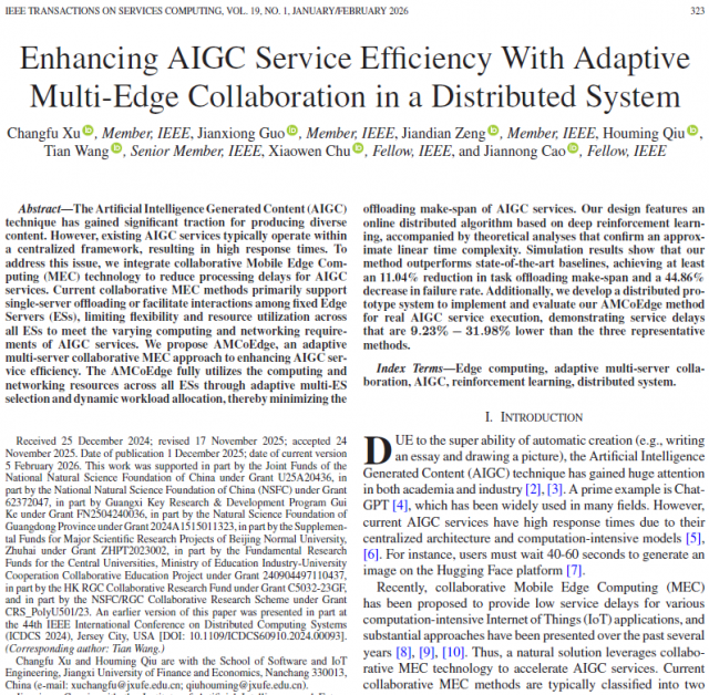 近日, 御书屋 徐常福老师以第一作者在服务计算领域国际顶级期刊IEEE Transactions on Services Computing(CCF A类期刊,校定A类期刊)上发表论文,论文题目为“Enhancing AIGC Service Efficiency with Adaptive Multi-Edge Collaboration in A Distributed System”。