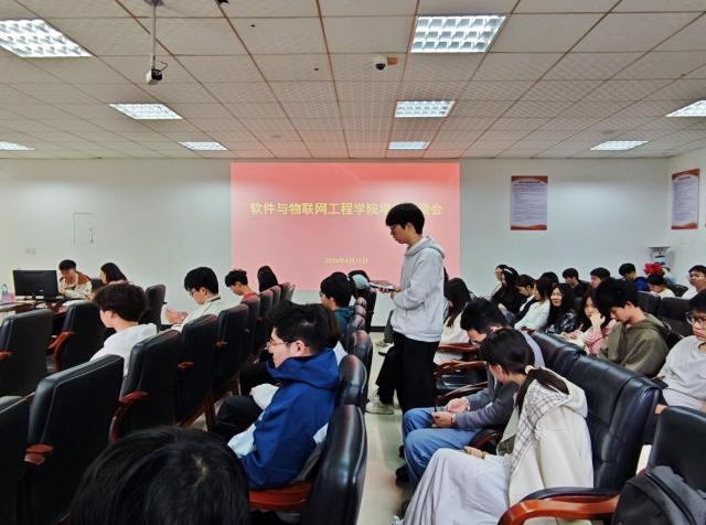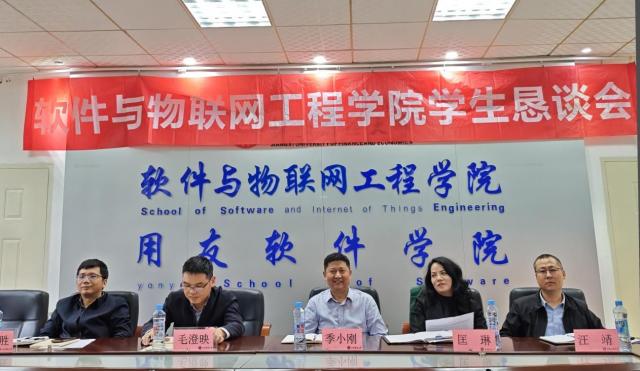 为畅通师生沟通渠道,精准回应学生关切,2026年4月15日下午, 御书屋 在荟庐二楼会议室召开院学生恳谈会。院党委书记季小刚、副院长(行政牵头负责人)毛澄映、院党委副书记匡琳、副院长罗远胜、副院长汪靖,软件工程(中外合作办学)系主任刘燕青,专职辅导员陶丽、邹璐、王安亮,研究生、本科生各年级学生代表共坐一堂,以“面对面,拉家常”的形式聚焦宿舍安全、教学优化、校园生活等议题,倾听学生诉求,共商解决方案。