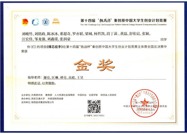 2018年“创青春”金奖获奖证书 2019年“挑战杯”特等奖获奖证书